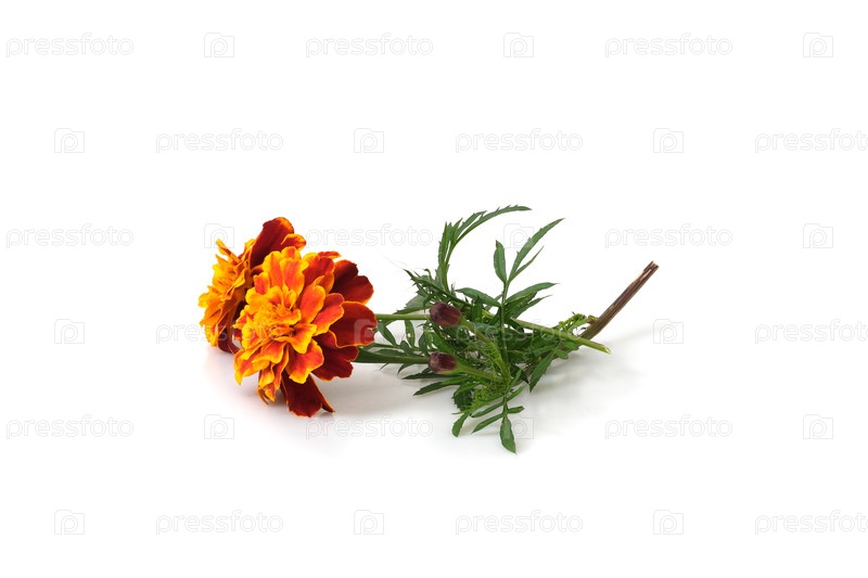 Один натуральный красный цветок бархатцев, изолированный на белом фоне