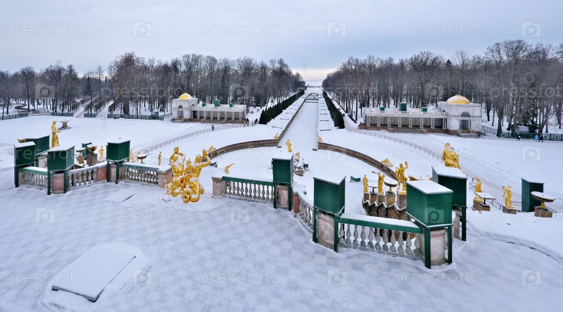 Зимний пейзаж в парке Петродворца (Петергоф, Санкт-Петербург). Вид на парадную лестницу
