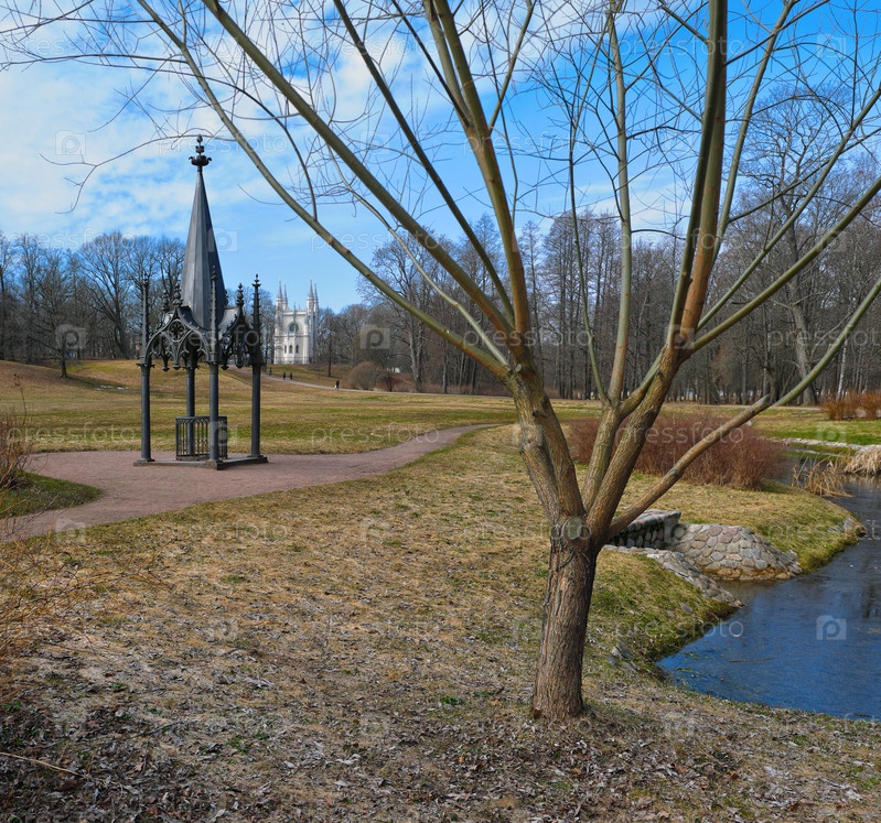 Россия, Санкт-Петербург, Петродворец, парк Александрия: Готический колодец и Готическая капелла (Церковь Святого Александра Невского) весенним днем
