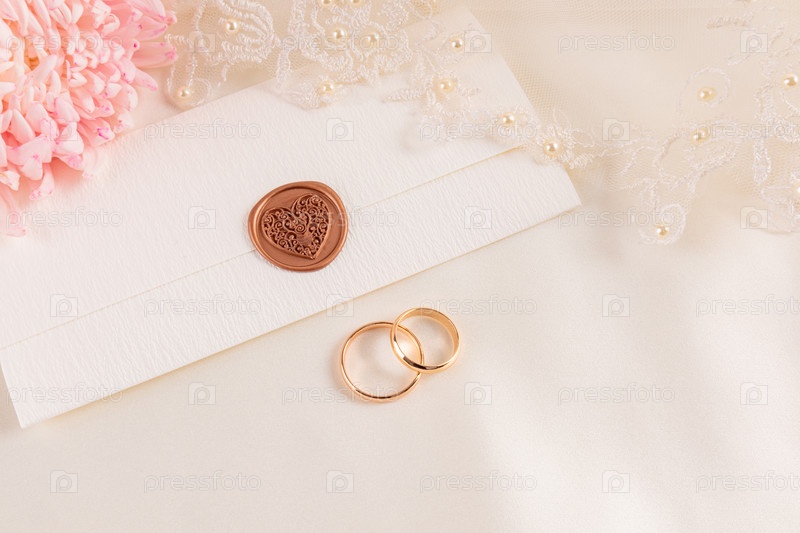 Красивый натюрморт, свадебная открытка, макет приглашения с золотыми обручальными кольцами на бежевом атласном фоне с конвертом и цветами. Свадебная концепция