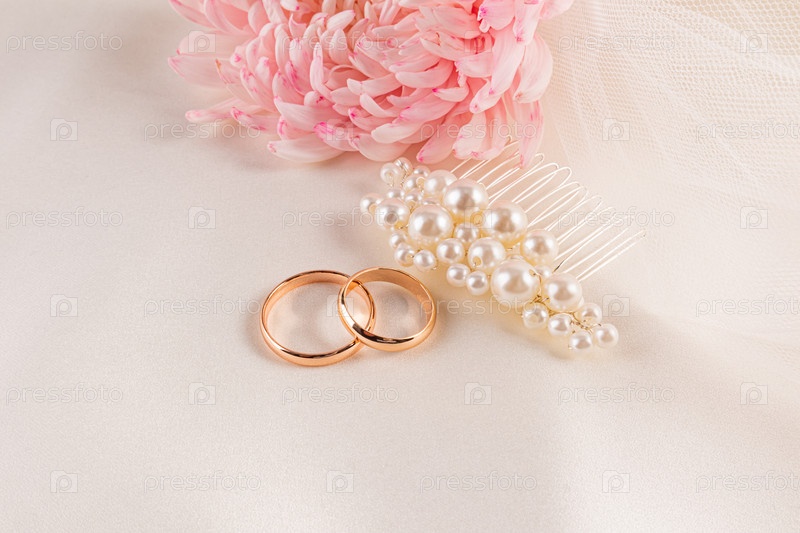 Два золотых обручальных кольца, жемчужная шпилька для волос, нежная фата цвета шампанского на фоне бежевого атласа с цветами. Красивая композиция, приглашение