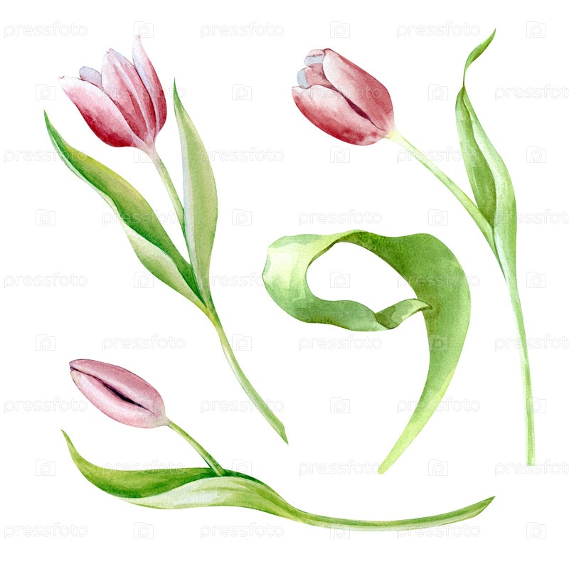 Акварель розовые тюльпаны, изолированные на белом фоне. Ботаническая иллюстрация. Красивые весенние цветы для оформления приглашений, открыток, поздравлений