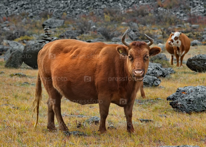 Россия. Горный Алтай. Небольшое стадо коров мирно пасется на осеннем пастбище в каменистой долине реки Чулышман