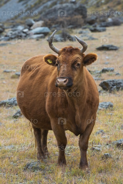 Россия. Горный Алтай. Небольшое стадо коров мирно пасется на осеннем пастбище в каменистой долине реки Чулышман