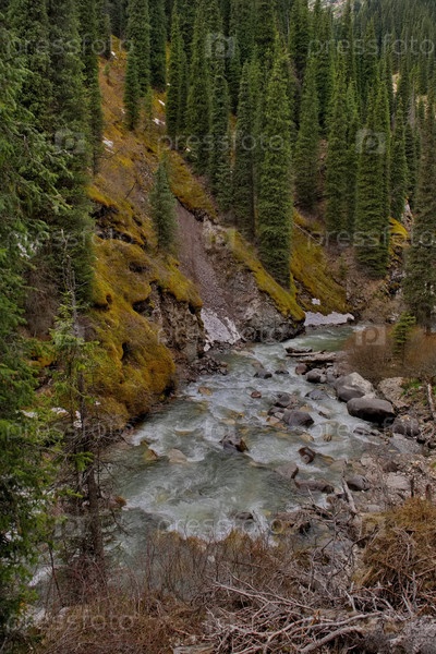 Кыргызстан, восточный берег озера Иссык-Куль. Вид на скалистую реку Арашан среди замшелых скал заросшего ущелья