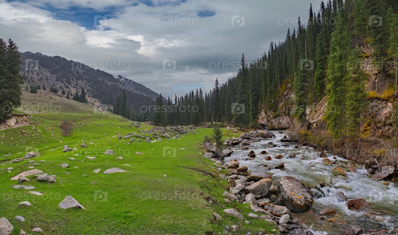 Кыргызстан, восточный берег озера Иссык-Куль. Вид на скалистую реку Арашан среди замшелых скал заросшего ущелья