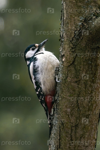Маленький пестрый дятел сидит на стволе дерева, выискивая личинки насекомых под корой