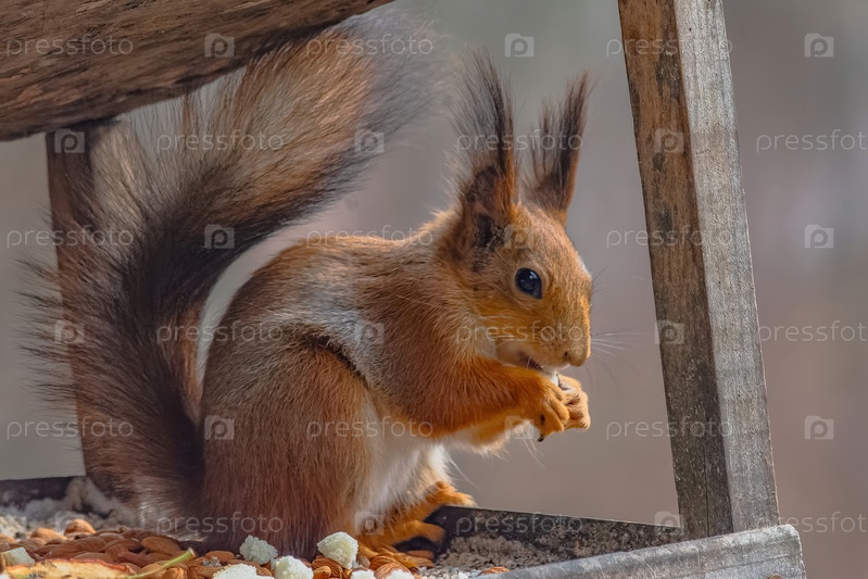Очаровательная евразийская рыжая белка с яркими глазами и пушистым хвостом наслаждается угощениями из деревянной кормушки в естественной лесной обстановке