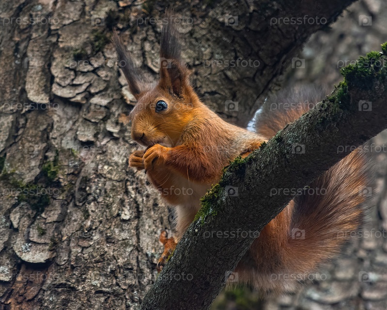 Очаровательная евразийская рыжая белка с яркими глазами и пушистым хвостом наслаждается угощениями из деревянной кормушки в естественной лесной обстановке