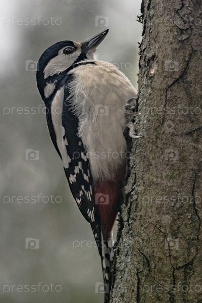 Маленький пестрый дятел сидит на стволе дерева, выискивая личинки насекомых под корой
