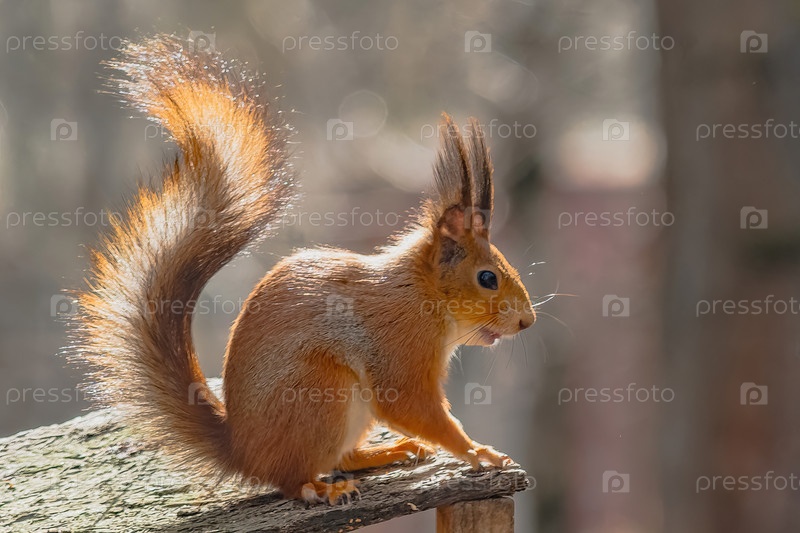 Очаровательная евразийская рыжая белка с яркими глазами и пушистым хвостом наслаждается угощениями из деревянной кормушки в естественной лесной обстановке