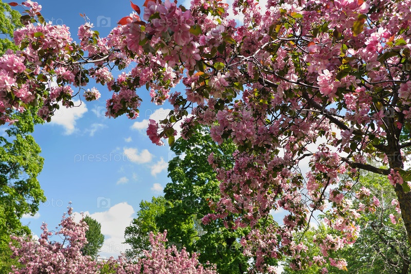 Цветущая розовая сакура на фоне голубого неба с облаками