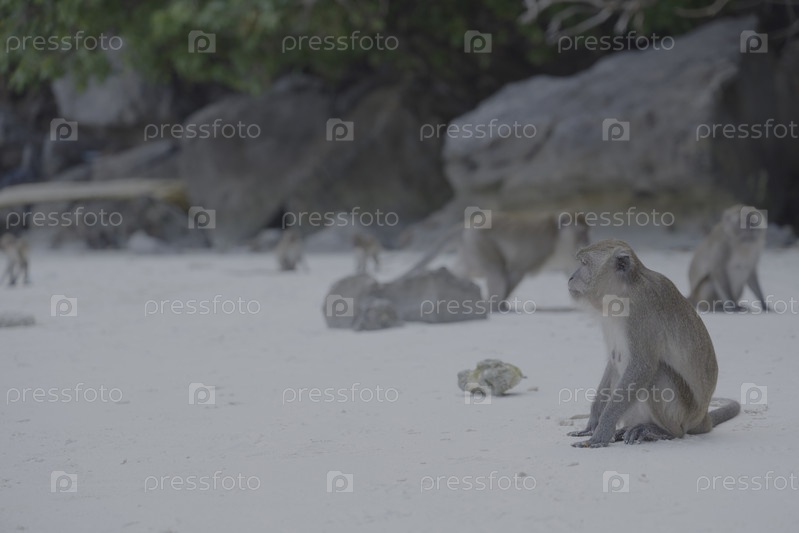 Обезьяны играют и весело отдыхают на прекрасном, тихом пляже под ярким солнечным светом