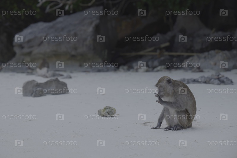 Одинокая обезьяна оказалась на тихом пляже, где царят спокойствие и безмятежность