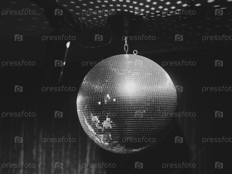 Красивый и мерцающий диско-шар изящно висит в элегантной черно-белой атмосфере