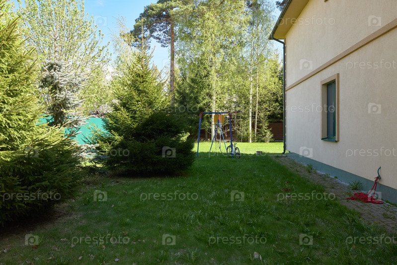 Тихий и спокойный задний двор с пышной зеленью и детской игровой площадкой
