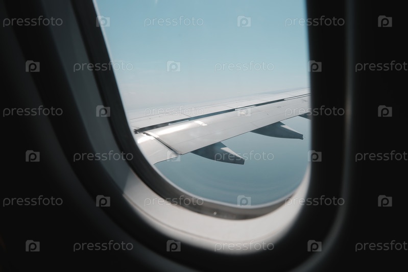 Наслаждайтесь видом с воздуха через иллюминатор самолета, на котором изображено крыло и прекрасное небо