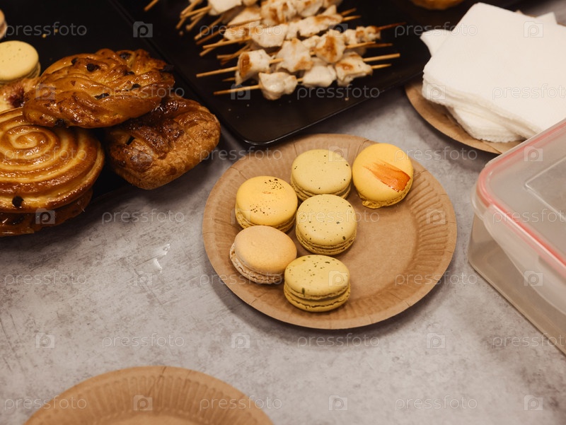 Красиво оформленный ассортимент вкуснейших макарон и пирожных на столе
