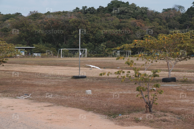 Заброшенное футбольное поле, покрытое зеленью и окруженное живописной природой