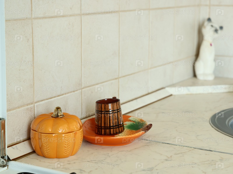 Очаровательный кухонный уголок, украшенный тыквой и очаровательной декоративной чашкой для осени