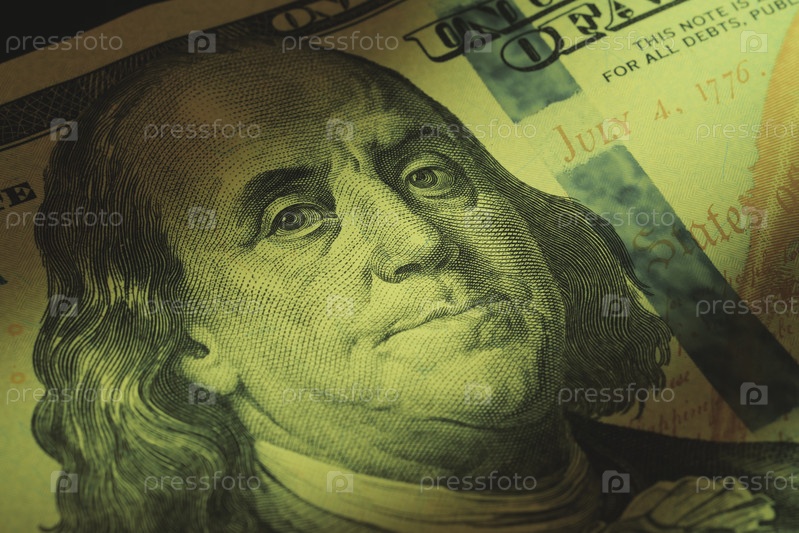 Это крупный план стодолларовой купюры США с изображением Бенджамина Франклина