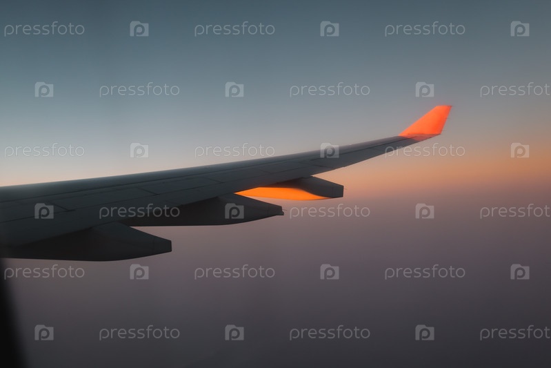 Красивый и живописный вид с крыла самолета во время величественного заката в небе