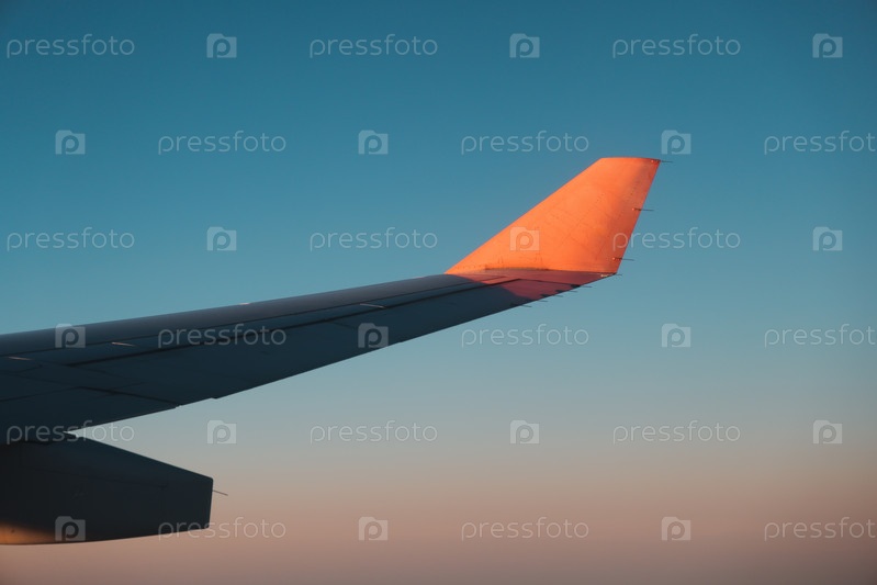 Потрясающий силуэт крыла самолета на фоне красивого красочного неба в сумерках