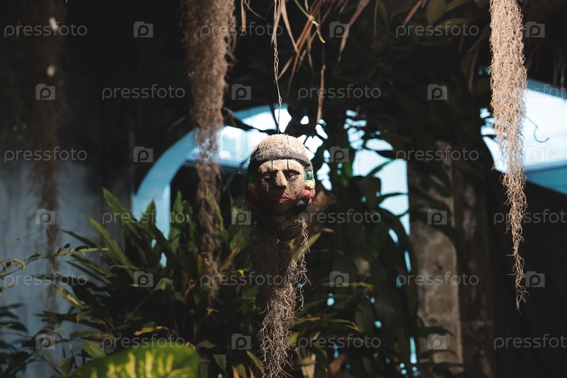 Загадочная маска на фоне пышного тропического пейзажа в окружении экзотических чудес
