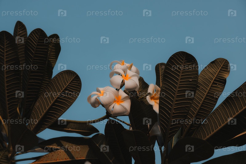 Потрясающе красивые цветы плюмерии на фоне ярко-голубого неба