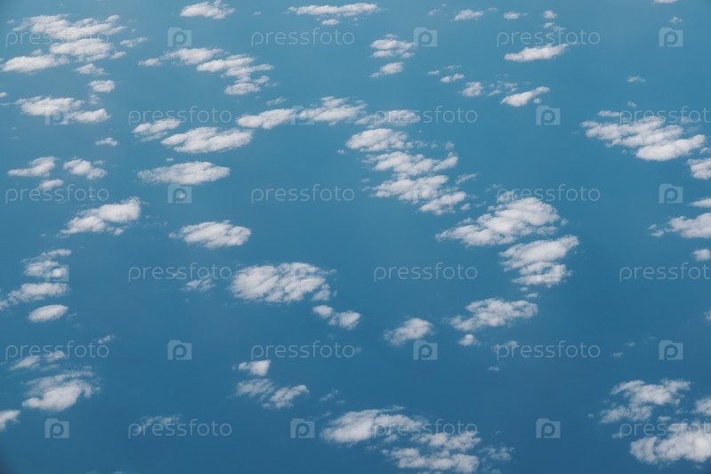 Вид с воздуха, демонстрирующий мягкие белые облака, грациозно плывущие на фоне глубокого синего неба