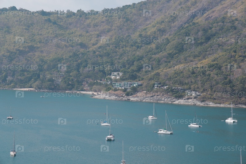 Красивый и спокойный прибрежный пейзаж с многочисленными парусными яхтами, идеально подходящий для отдыха