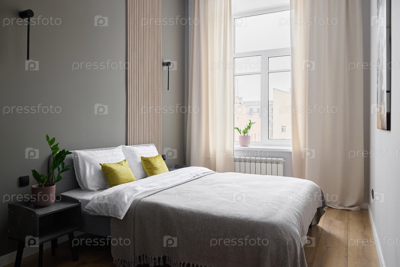 Стильная и минималистичная спальня с обилием естественного света и пышной зеленью