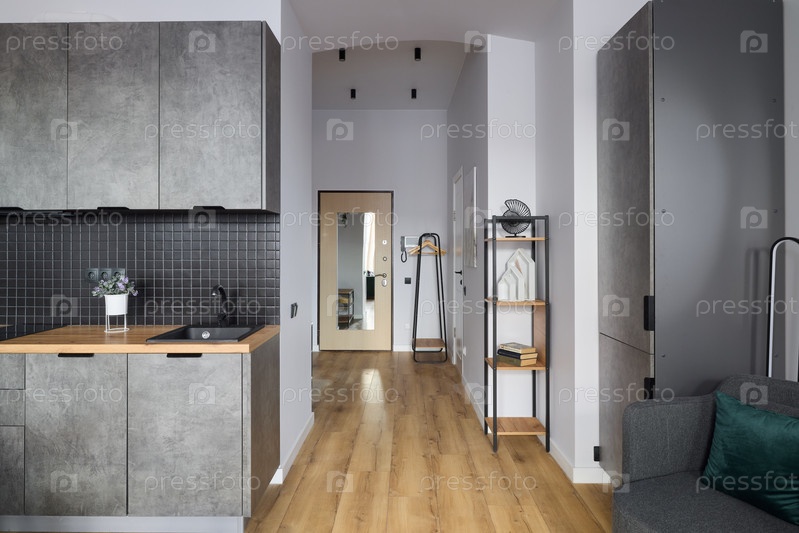 Интерьер современной минималистичной квартиры включает стильную кухню и прихожую