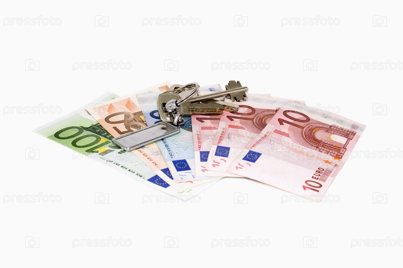 Деньги и ключи от квартиры на белом фоне