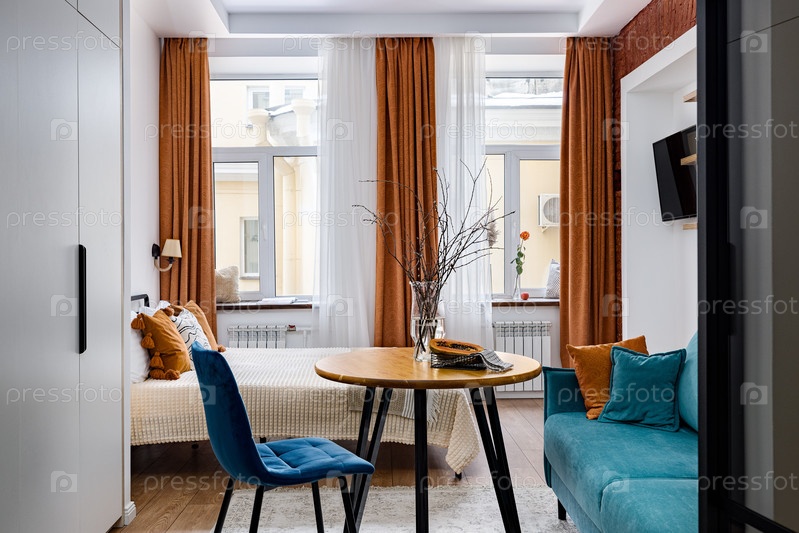 Элегантный и стильный современный номер с удобной мебелью и яркими окнами