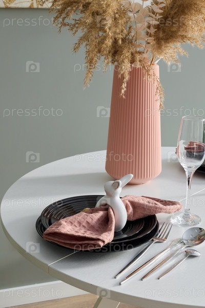 Элегантная сервировка стола с декоративным кроликом и современной вазой для стиля