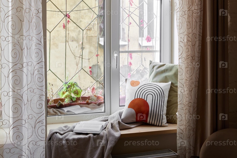 Уютный уголок у окна, украшенный красивыми декоративными подушками и мягким пледом