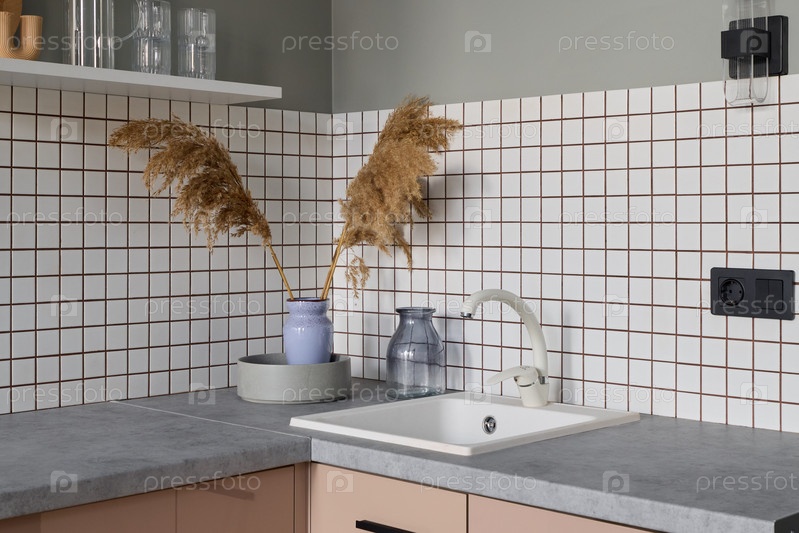 Этот современный кухонный уголок украшен бежевой плиткой и декоративными элементами, подчеркивающими его стиль