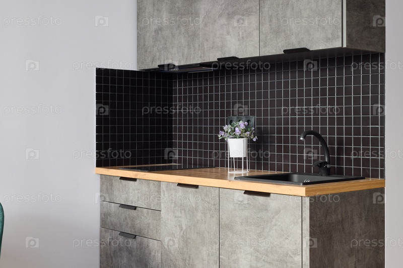 Это современная кухня с потрясающим дизайном, бетонными поверхностями и элементами из черной плитки