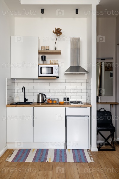Модный современный дизайн кухни с элегантными белыми шкафами и очаровательными деревянными акцентами
