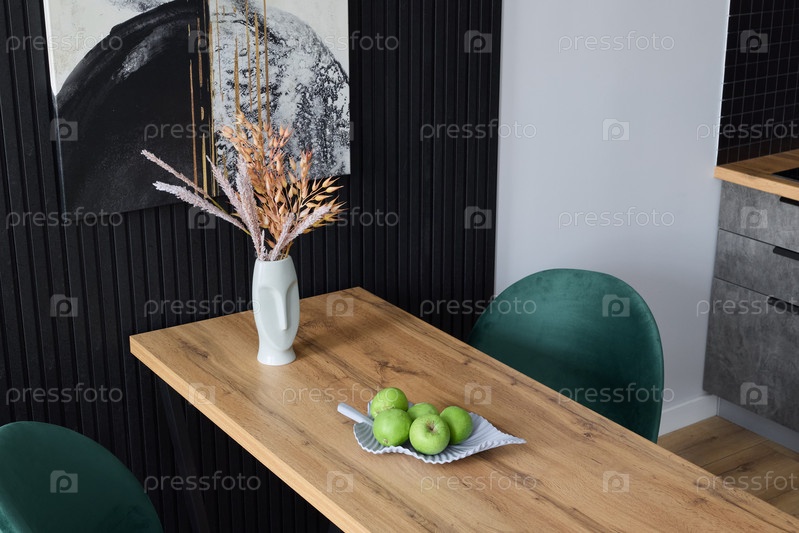 Современная столовая с шикарным минималистским декором и красивыми свежими яблоками