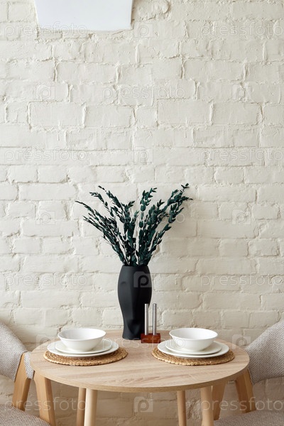 Элегантная обеденная обстановка в стиле минимализма с красивой вазой и аккуратно расставленными тарелками