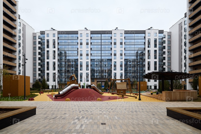 Современный жилой комплекс с детской игровой площадкой и просторной зеленой зоной