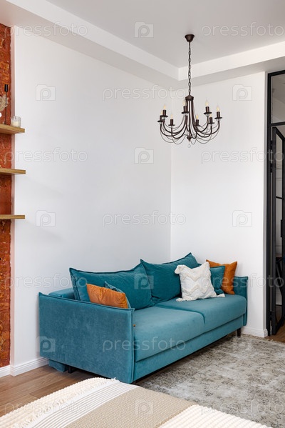 Стильный бирюзовый диван в современном жилом пространстве, дополненном элегантной люстрой