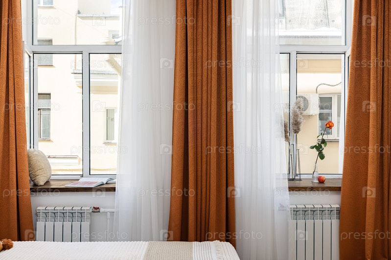 Это уютная и гостеприимная спальня с теплыми шторами, пропускающими много естественного света