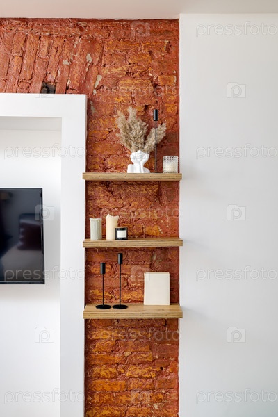 Стильная полка для гостиной с декоративными элементами и фактурной стеной для создания уникальной атмосферы