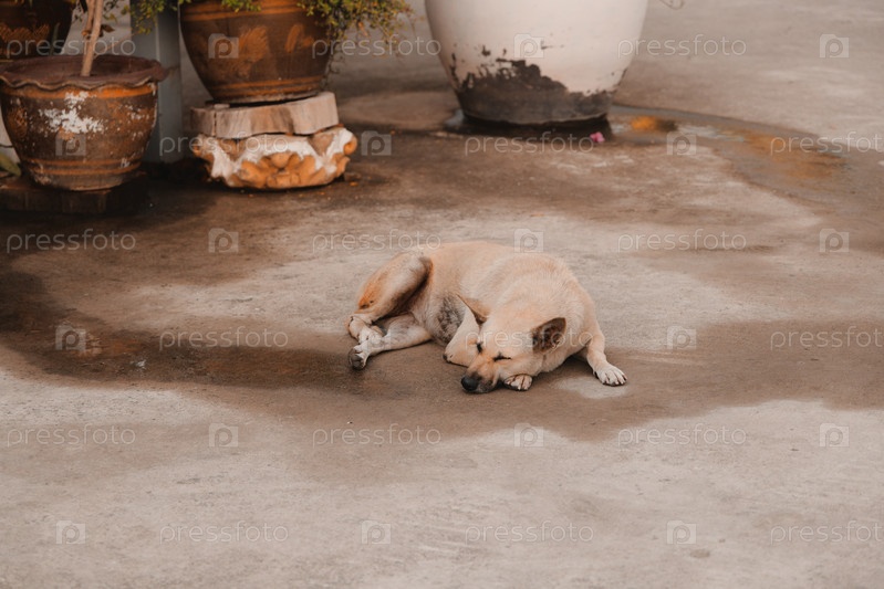Спокойная собака комфортно отдыхает в городской обстановке, испытывая чувство спокойствия