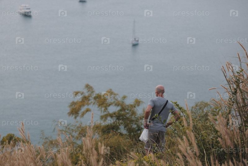 Мужчина наслаждается походом у воды, вдали видны лодки