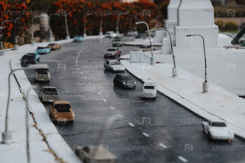 Миниатюрная уличная сцена города демонстрирует яркие автомобили и очаровательные уличные фонари в искусстве и дизайне