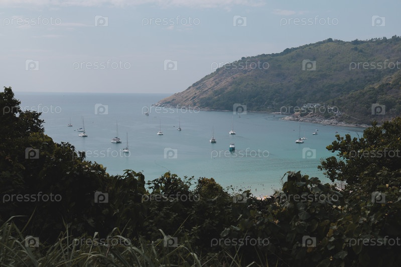 Спокойный прибрежный вид с лодками, окруженный зелеными холмами поблизости